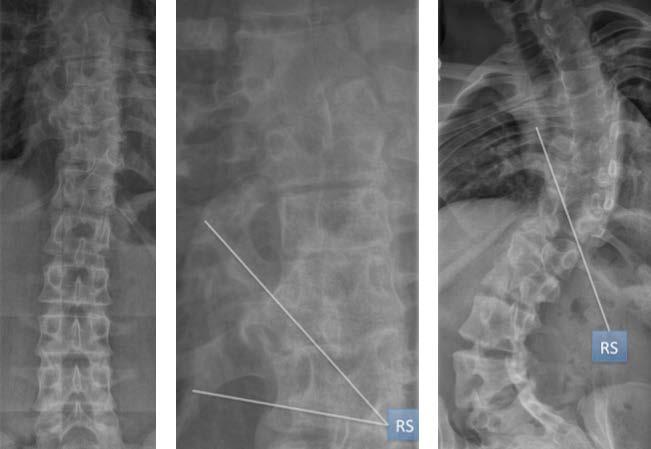 Abbildung 3: Einplattentechnik. Im Zeitalter des digitalen Röntgens unter Verwendung der „direct radiography“ (DR) kann man die Wirbelsäule von Kindern und Adoleszenten bei optimaler Einstelltechnik unter Einblendung des Strahlenfeldes auf die absolut notwendige Region (Region of Interest/ROI) fast immer auf eine DR-Platte bringen, ohne weitere Aufnahmen zu machen. Dadurch werden unnötige Bestrahlungen größerer Körperregionen außerhalb der ROI vermieden. Links weit eingeblendetes Röntgenbild der Patientin (Mitte) ohne Korsett und rechts Röntgenkontrolle der Patientin mit Korsett.