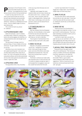 7. JACKALL TN50, tn60 and tn70 Everyone knows how great Jackall TNs are for catching bass. Their choice of colours is endless and the bass absolutely love them, especially on the dead roll. The TN60 I use a lot in spring, while the smaller TN50 is a go-to when I need something a little smaller and less aggressive. They’re a must-have for your tackle box and are perhaps best thrown with spin gear.