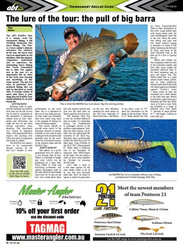 This is what the BARRA Tour is all about. Big fish and big smiles. performance on the score sheet. Nor is it indicative of the size of your bank account. To find, hook and ultimately land even metre long barra is the pinnacle of fishing for many Australian anglers. This article intends to provide some clarity to the enormous amount of options available on tour and to open a dialogue with successful and seasoned pros on the musthaves for a successful sojourn to the northern lakes and the BARRA Tour. SOFTY DOES IT ‘Soft plastic’ is a pretty generalized term for what is a very diverse style of lure. There’s a multitude of shapes and sizes, which can be perplexing on a shop wall. From flukes to frogs and everything in-between, soft plastics encompass some of the most effective and reliable barra lures we’ve seen on the tour. Let’s break down these
