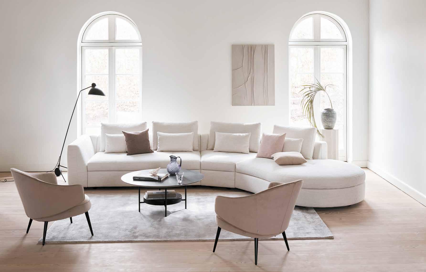 smoothly meanders over its calming curves before the body melts into them. Its rounded corners and integrated tables prompt socialising. Its tonal taupe upholstery and teak details create tranquillity. Its sink-into-me softness is all about snuggling. Finally, say goodbye to limitations with the Choice Chair: a modern interchangeable seating system of different parts, it’s created with flexibility, classic Scandi style, and the environment at its forefront. The pioneering modern chair is based around a seat produced with up to 98% recycled polypropylene, its cover and legs designed to be changed without tools, transforming it from metal sled-based bar stool to teak-legged dining chair. And at the end of its life? Effortlessly recycled.