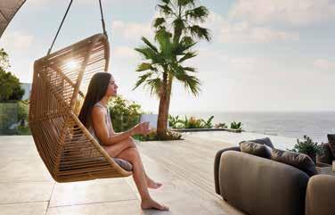 The Peacock Chair straddles the bridge between indoor and out – pretty and practical, visually like something that belongs inside, but ready to be exposed to the elements. Member of a comprehensive collection of designer outdoor seating, the range’s brutalist grey palette echoes the tones of many buildings’ exteriors (and the occasional sky...), while its curved forms mirror contemporary interior trends, with natural accents pulling them both together. Calming the designer chair’s predominant greyscale tones are teak legs and woven seats made from weather-proof soft rope, which speak of nature and craft tradition, adding an elegant, shouldn’t-that-be-protectedfrom-the-rain edge.