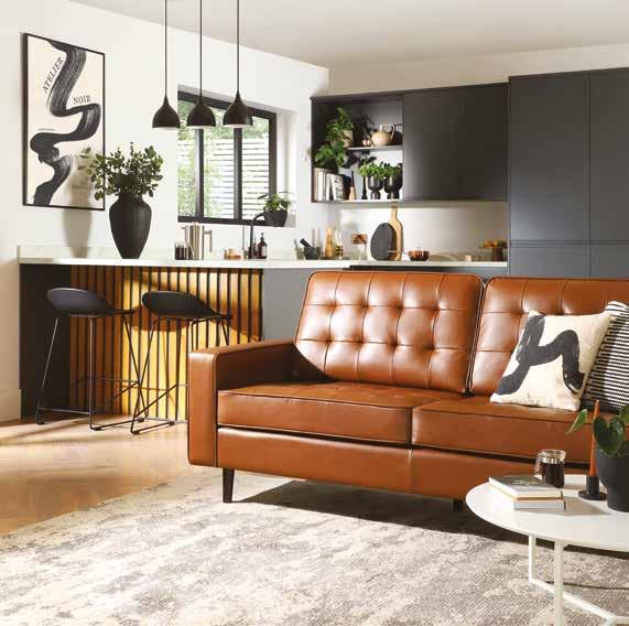 Choose from brown, beige or cream to complement the wooden flooring. “Dress up your living area with a faux leather sofa in a rich tan brown,” Rebecca says. Match the vibe using other soft textures such as neutral cushions. Zone the living area with a stylish modern rug for a chic, layered look.