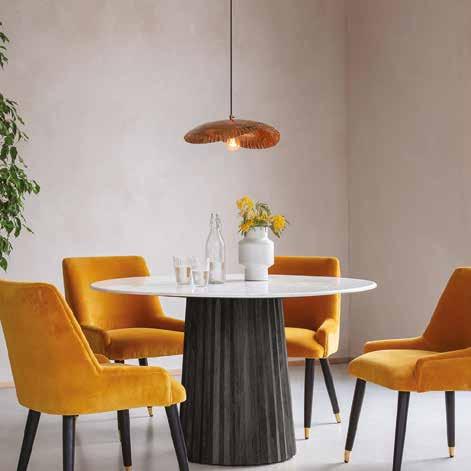 Even though modern industrial style favours clean lines and sharp finishes, break up the edges with curved or round accents. “Pick a round pedestal dining table and curved dining chairs for a distinctive look,” Rebecca says. Accessorise with a round pendant lamp or mirror to complement the dining set. Create a fresh, uplifting feel with artwork and greenery. furniturechoice.co.uk