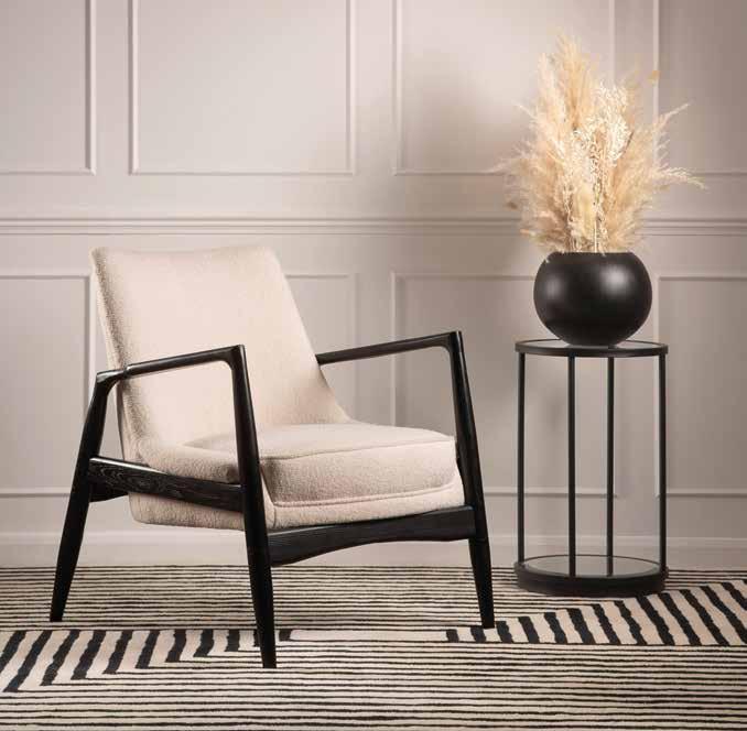 Armchair in Borg Cream takes inspiration from the interiors of 1960s California. The soft, tactile Borg fabric makes for a striking contrast against the solid ash frame, with matt black finish, and brass feet caps. For the ultimate in glamour, the Ella Loveseat in Black is sure to be a talking point. Inspired by American Art Deco, it comfortably seats two adults for a cosy movie night. To complement the Art Deco look, the Rubell Stool in Black is a handy occasional or footstool; so too is the Senio Hexagonal Stool in Black Velvet with a brass-finish hexagonal base.