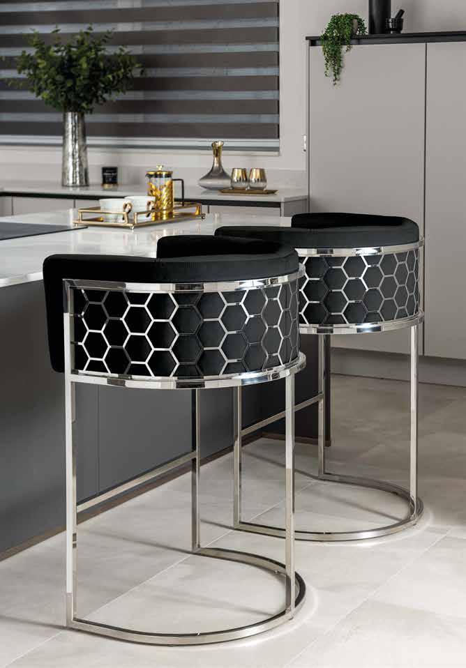 To complement the monochrome dining look, Black Alveare Dining Chairs in Chalk look simply fabulous alongside a black or white table. The distinctive laser-cut hexagonal detailing in matt black sits beautifully against the cushioned backdrop of cool chalk velvet. Matching Black Alveare Counters Stools look super stylish with a white or black counter or kitchen island.