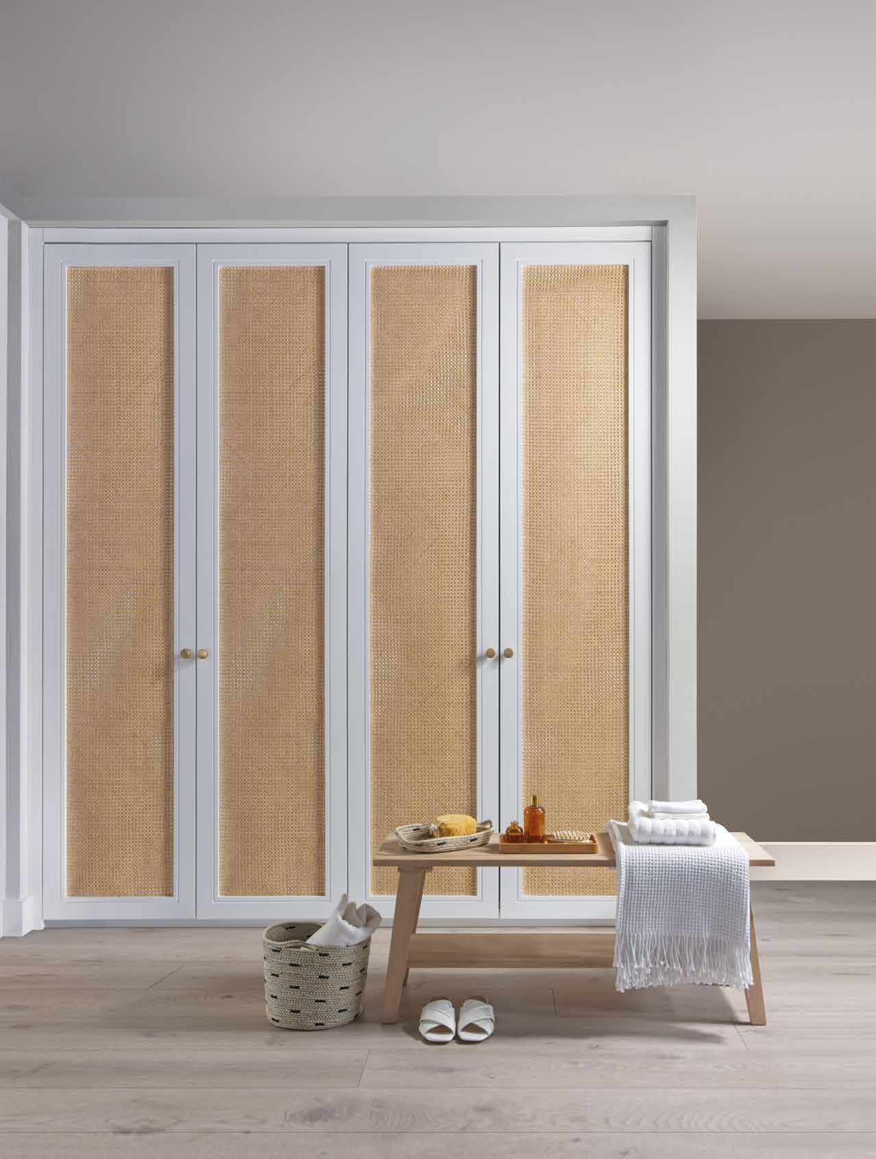 The matching Kingston Wicker Chest of Drawers features six soft-close drawers allowing for generous storage. The handles add a luxurious touch with their brushed brass finish. The Kingston Wicker Dressing Table incorporates handy cable ports in the cupboards, making it practical for use as a dressing table or home office desk. Completing the collection is the Kingston Wicker Bedside Table.