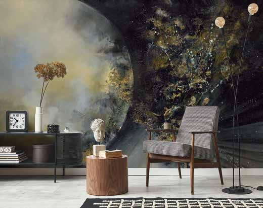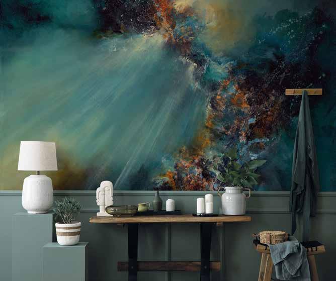 Now a full-time artist, Alison creates immersive pieces using oils, palette knives, and mixed media, producing evocative abstract landscapes that range from quiet serenity to raw intensity. Her atmospheric works, now reimagined as large-scale wallpaper murals, allow homeowners and designers alike to bring striking depth and emotion to their interiors.