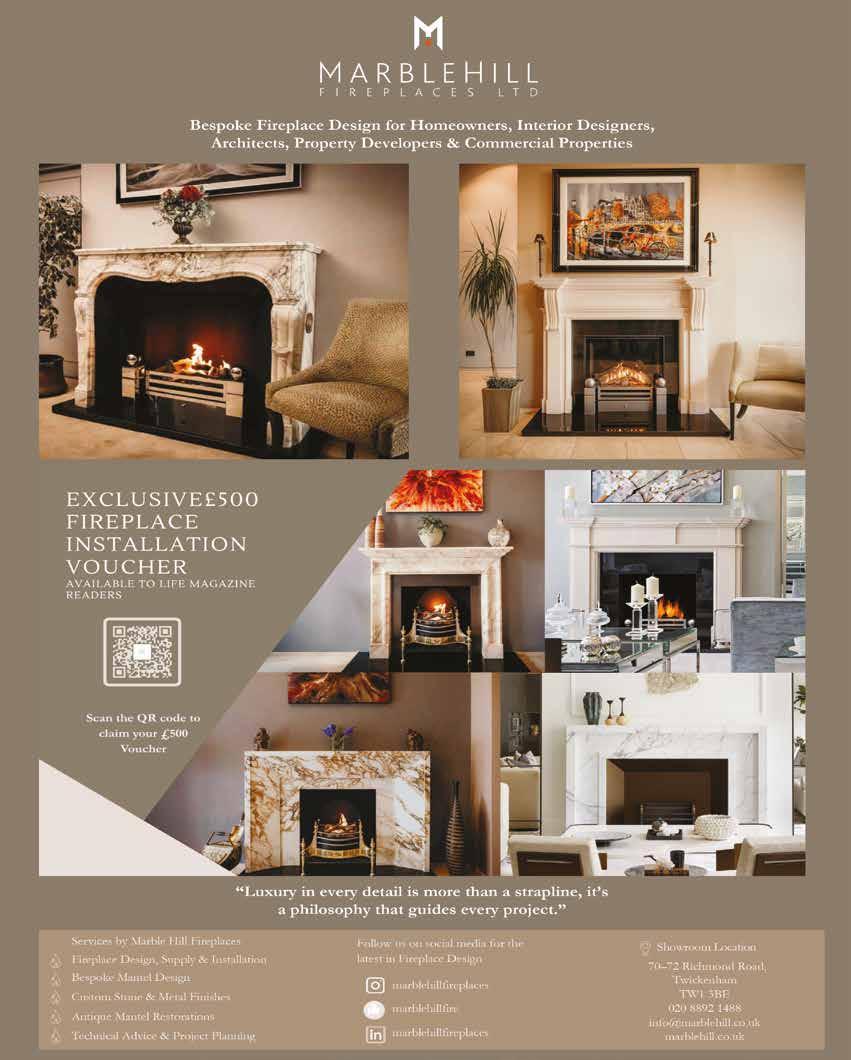 brands. Whether your vision is understated minimilism or ornate period authenticity, every project is guided by one principle: luxury in every detail. Complementing these fires is the brand’s in-house design and fabrication studio, where bespoke fireplace surrounds are created in marble & limestone. Each is tailored in proportion, finish, and detailing, ensuring that no two are alike. And for historic properties, Marble Hill’s restoration service breathes new life into original period mantels with the same dedication to authenticity and craftsmanship.