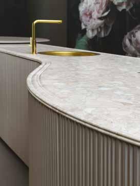 irregular three-dimensional pattern, designed to hide the joint between the modules and ensure a unitary perception of the entire arrangement. The irregular contours, the alternation between full and empty space, and the play of light and shadows conceal the openings of the doors, thus contributing to the final camouflaged effect. The Tangram range is available in lacquer, structured lacquer, metallic lacquer and woods including Elm and Oak. Worktops are shown in leathered marble finishes – with a drip groove and Macaron detail on the leading edge. Handles are the new OI and Accento.