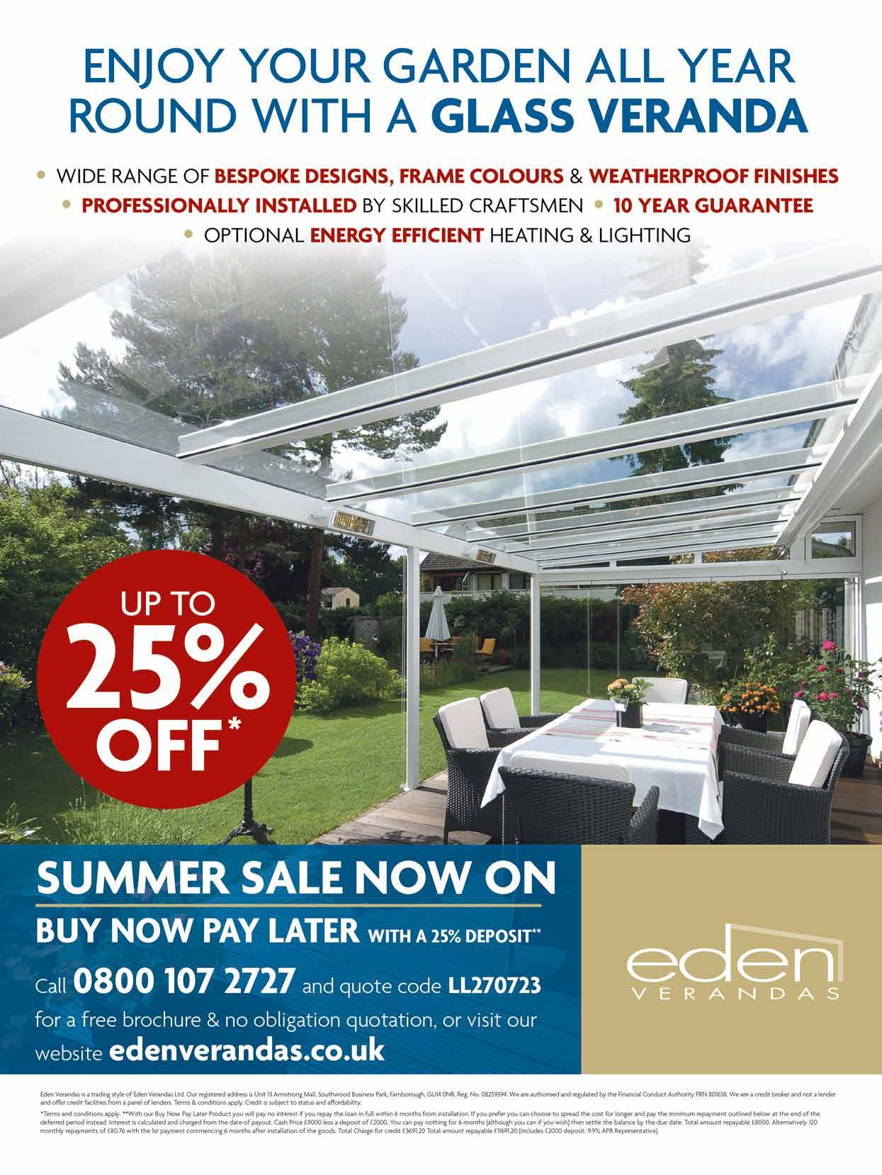 An Eden Veranda or Eden Glass Room is a fantastic addition to any home. To turn your dreams into reality, call 0800 107 2727 and benefit from up to 25% off when you quote code LL270723 and one of our operators will be happy to be of assistance to you. Terms & condition apply, see website for details. edenverandas.co.uk