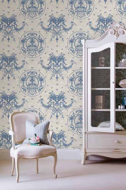 The floral design depicts an elegant, damask-like design from the early 19th Century, adorned with delicate garlands of roses, lilies and cornflowers, together with ornate scrolls.