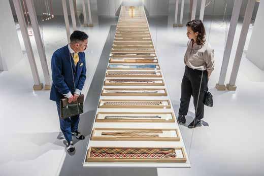 KUMIHIMO: Japanese Silk Braiding by DOMYO at Japan House London brings kumihimo to life through large-scale installations, captivating videos, presentations of tools and processes, as well as more than 50 examples of the braids themselves, artfully displayed throughout the gallery. Three distinct sections explore kumihimo’s history, structure, and future potential. The exhibition is beautifully laid out, with enlarged braiding stands that allow visitors to get up close to the process, allowing them to appreciate the detail in the braids that is so fine it can be easy to miss.