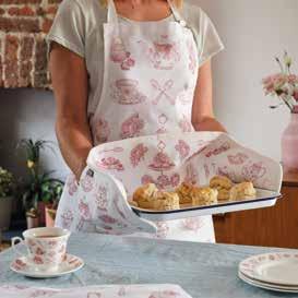 The collection includes two mugs, one with the word ‘mum’ inscribed on the inner rim, tea towel, apron, double oven glove, oven mitt, canvas bag, jugs, cosmetic bag, wash bag, notecards, cushion cover, pot grab, coaster, shortbread biscuits, and English breakfast tea.
