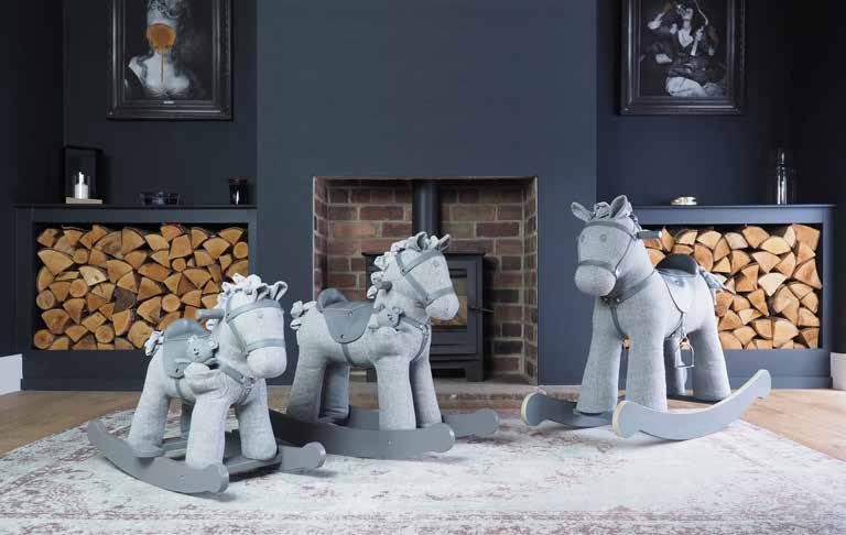 Stirling is a beautiful rocking horse, standing proudly on smart painted grey rocking rails with contrasting pale end grain. Dressed in an on-trend textured grey herringbone fabric, with a matching grey softly padded leatherette saddle and bridle, he suits both modern and traditional home interiors alike. His sturdy wooden frame is built to last and he comes complete with a super soft scrunchy faux suede mane and tail and supportive stirrups.