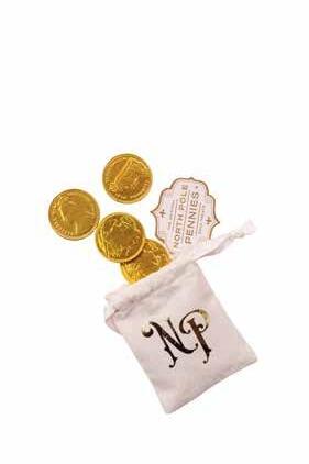 • North Pole Pennies - chocolate coins tucked inside a natural bag, with a brand new gold foil hand-stamped tag. (also available to buy separately) Includes biodegradable glitter for our Magic