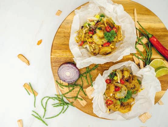 garlic taste marinade en bak dit even kort aan. Verdeel de rijst over 6 bakjes/pannetjes en doe dit ook met de fruit de mer. Voeg de Epos salsa-picantesaus toe en garneer af met een plakje citroen en verse peterselie. Je zou hier