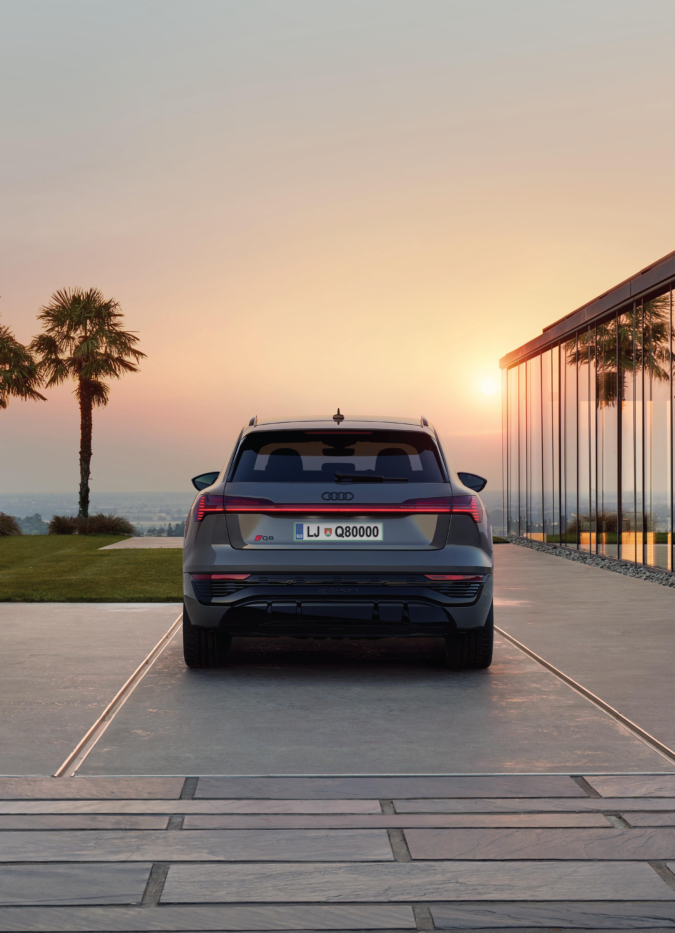 Podatki o porabi in emisijah za Audi Q8 e-tron: Kombinirana poraba električne energije (kWh/100 km): 24,7. Emisije CO₂: 0 g/km. Emisijska stopnja: AX. Emisije CO₂ so odvisne od vira električne energije. Audi zato priporoča uporabo ekološko pridobljene elektrike. Ogljikov dioksid (CO₂) je najpomembnejši toplogredni plin, ki povzroča globalno segrevanje. Emisije onesnaževal zunanjega zraka iz prometa pomembno prispevajo k poslabšanju kakovosti zunanjega zraka. Prispevajo zlasti k čezmerno povišanim koncentracijam prizemnega ozona, delcev PM₁₀ in PM₂̦₅ ter dušikovih oksidov. Porsche Slovenija d.o.o., Bravničarjeva 5, 1000 Ljubljana. Slika je simbolna. Več na audi.si.