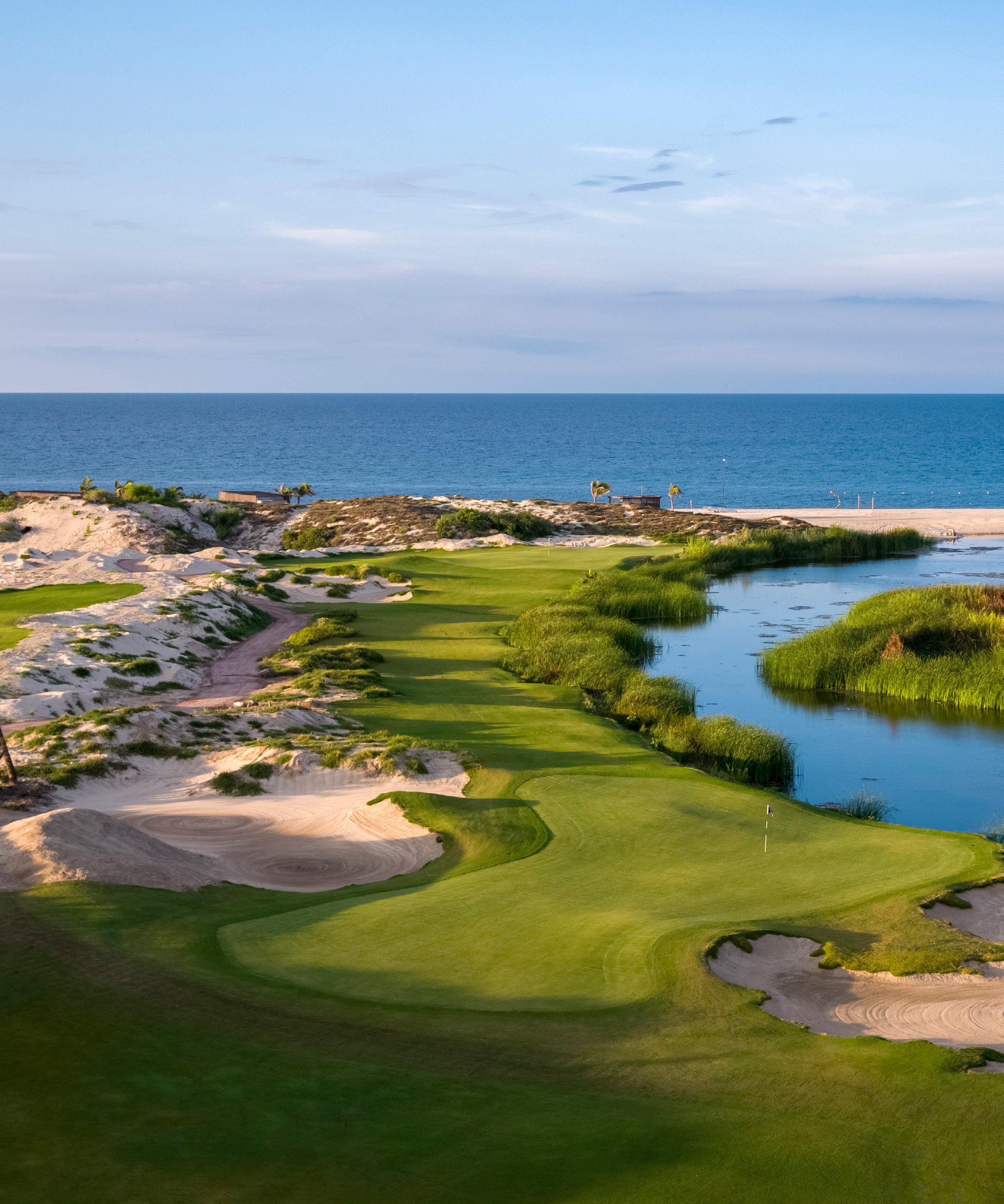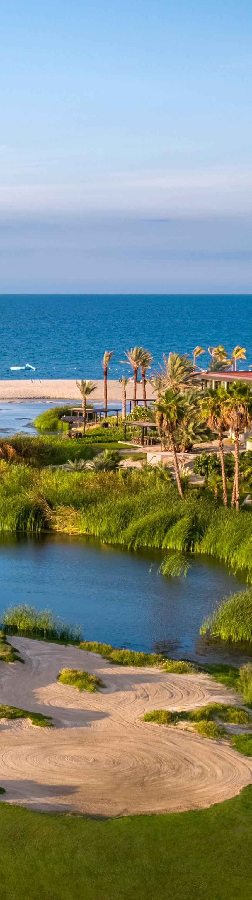 Ein Golfplatz auf Weltklasse-Niveau mit 18 L chern, der Wüsten- und Meerblicke bietet.