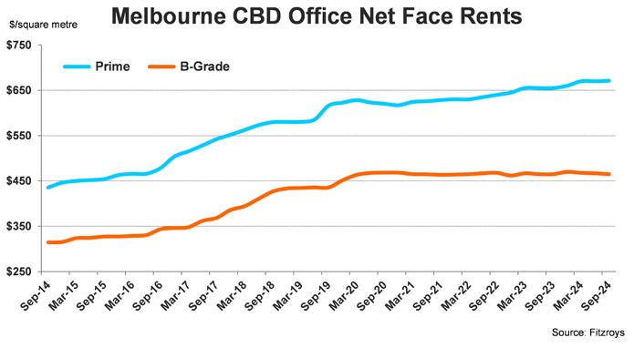 While gross face rents for Melbourne CBD offices have risen as a result of increasing outgoings and incentives, net effective rents fell over the 12 months to September 2024. The availability of diverse, high-quality offices in the CBD continues to drive competition amongst owners which has pushed prime incentives to historical high levels. Reflecting the number of prime office vacant opportunities and competition for tenants, secondary net face rents have declined slightly through 2024.