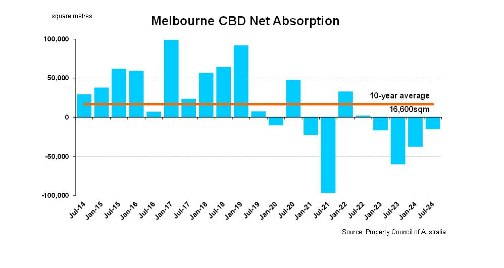 According to the PCA, the Melbourne CBD office market recorded negative net absorption of 15,435sqm in the six months to July 2024, the best result in two years. In comparison, the 10-year average half-year net absorption level for the Melbourne CBD office market is 16,600sqm.