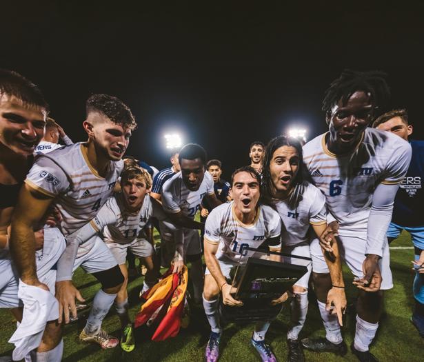 Junior running back Lexington Joseph (#8) celebrates with teammates after scoring a touchdown in FIU’s thrilling 38-37 overtime victory in the team’s 2022 season opener against Bryant. Sam Ebanks ‘20 soars over a hurdle for the Panthers. Trejon Jacob ‘20 dribbles past an FAU defender during an intrastate showdown at FIU’s Ocean Bank Convocation Center.