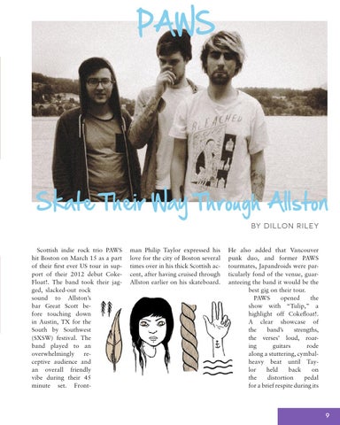 Skate Their Way Through Allston by Dil lon Ri l e y Scottish indie rock trio PAWS hit Boston on March 15 as a part of their first ever US tour in support of their 2012 debut CokeFloat!. The band took their jagged, slacked-out rock sound to Allston’s bar Great Scott before touching down in Austin, TX for the South by Southwest (SXSW) festival. The band played to an overwhelmingly receptive audience and an overall friendly vibe during their 45 minute set. Front-
