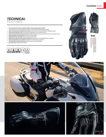 TECHNICAL FEATURES Full-grain goatskin construction for suppleness (topside) / full-grain cowhide (palm) for durability. Structure cuir pleine fleur de vache (dessus) pour la résistance / cuir pleine fleur de chèvre (paume) pour la souplesse. Carbon metacarpal-knuckle and knuckle protective shells. Coques de protection métacarpo-phalangienne et phalanges en carbone. Carbon protective palm slider shell. Coque de protection de l’hypothénar (« slider » de paume) en carbone. Forearm protection featuring a leather panel and memory foam. Protection de l’avant-bras par panneau de cuir et mousse à mémoire de forme. Weatherproof Hipora® internal membrane. Membrane interne étanche Hipora®. Thinsulate™ 180 g thermal insulation. Doublure thermique Thinsulate™ 180g. Digital Pittards® leather palm reinforcement for optimal grip. Renfort palmaire en cuir Digital Pittards® pour un grip optimal. Kevlar® patch hypothenar muscle reinforcement. Renforts de l’éminence thénar par patch Kevlar®. Perforated leather accordion comfort gussets. Soufflets d’aisance en cuir perforé accordéon. Dual closure system. Double système de fermeture.