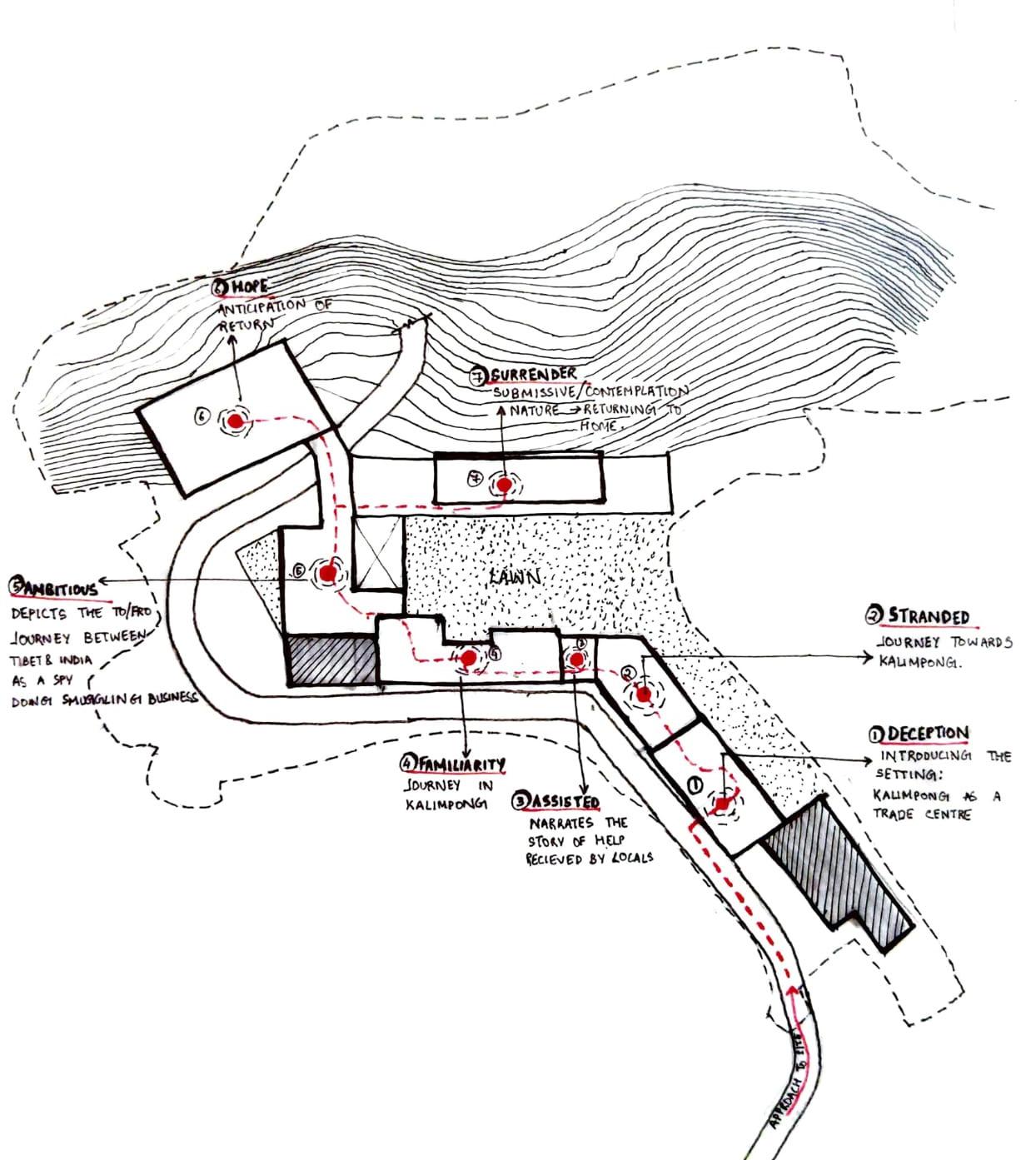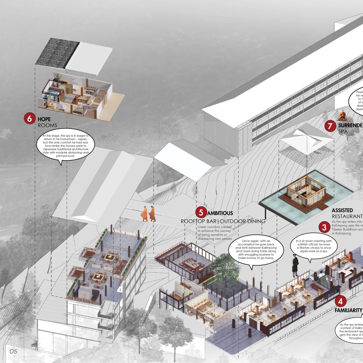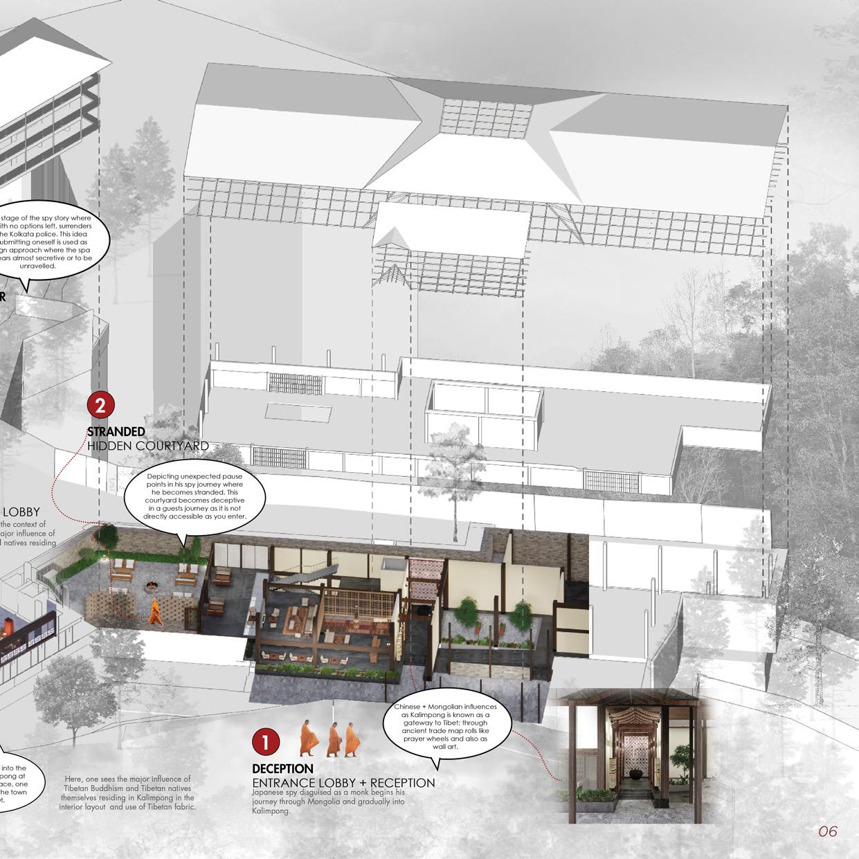 The project is focused on contextualising an interior space. The concept for design is derived from the idea of Kalimpong’s fascinating history of being the “NEST OF SPIES” and other espionage activities. The design is intended to narrate the story of a foreign Japanese spy who traversed through Mongolia, Tibet and eventually Kalimpong and to establish the fusion of various global influences that now shapes the personality of the city and its character.