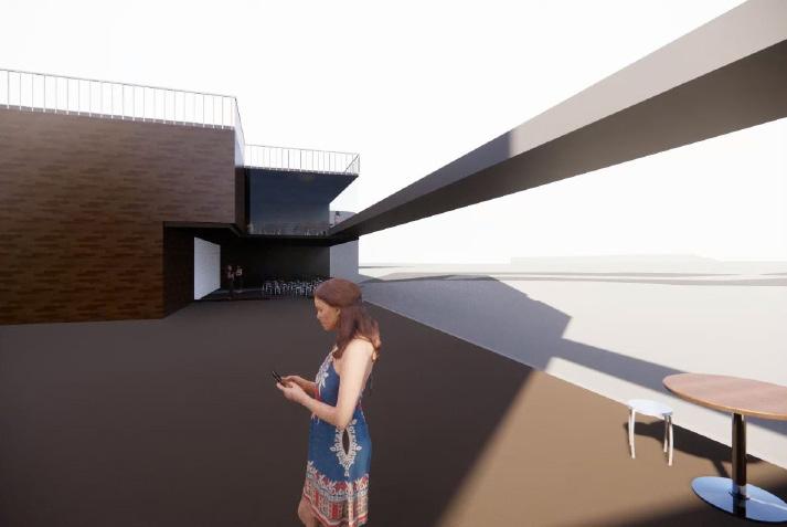 A stream of water will run along the outside of the exhibition building. This will attract people to visit the museum, but it will also provide an experience for those who are inside the exhibition, as they can look out the strategically placed vertical windows to see not only the water surrounding them but also across to another exhibition or outdoors.