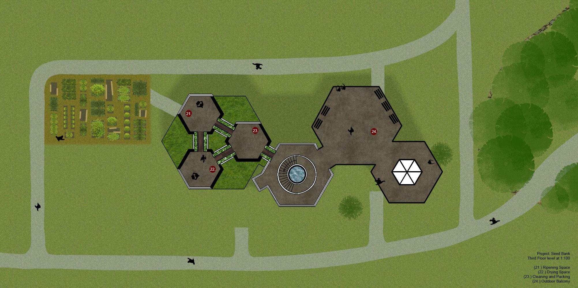 Seed store preparation spaces comprising drying (10 sqm), ripening (5 sqm), cleaning and packing (10 sqm)