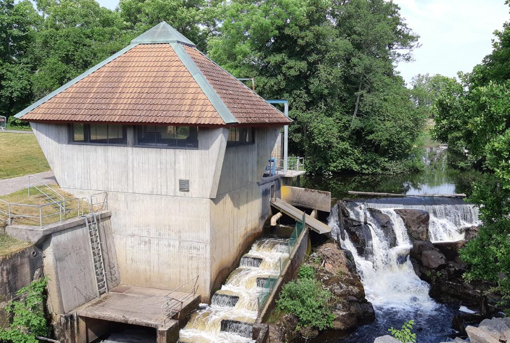 brú. Fyrir ofan hana var stífla og að því virtist, laxastigi eða eitthvað svoleiðis við einhverja nútímabyggingu sem gæti verið stöðvarhús þar sem það stóð við stífluna.