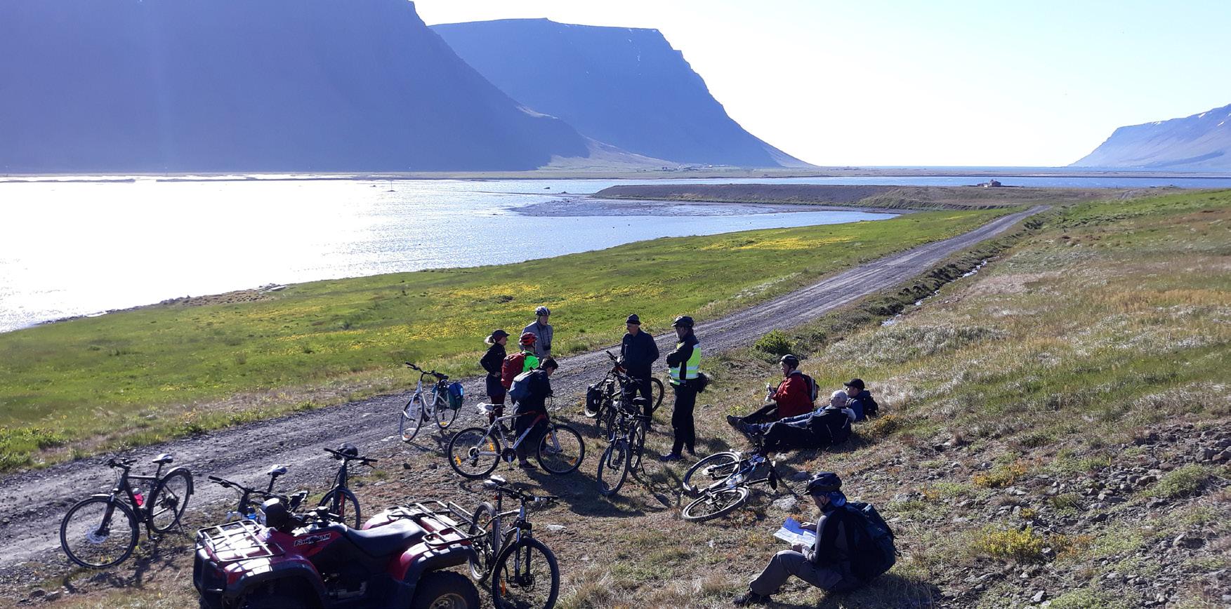 Móðir okkar Jörðin snýst um Önundarfjörðinn. Ég var nýbúinn að teikna gönguleiðakort af innsta hluta fjarðarins fyrir ferðabóndann Pál í Korpudal. Páll ólst þar upp. Hann er minnugur, fróður og skemmtilegur. Mér fannst því kjörið að fá hann til að segja frá svæðinu og kynna í leiðinni nýja kortið. Hann var hinn eiginlegi fararstjóri. Ég gerði ekki annað en að skipuleggja ferðina. Því klúðraði ég. Venjulega þegar ég hjóla þennan tæplega 15 km hring er ég um klukkutíma að því. Ég reiknaði með einum og hálfum til tveimur tímum en þeir urðu fjórir. Það var