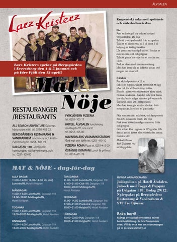 Fyrklövern Pizzeria tel. 0251-103 17 Hotell Ălvdalen lunchmeny, middagsbuffĂ©, Ă la carte tel. 0251-105 00 Navardalens vildmarksstation God mat och kaffe tel. 0251-410 10 Pizzeria Roma Pizza tel. 0251-415 00 ĂstĂ€ngs kompani Lunch & grillmat tel. 0251-431 76