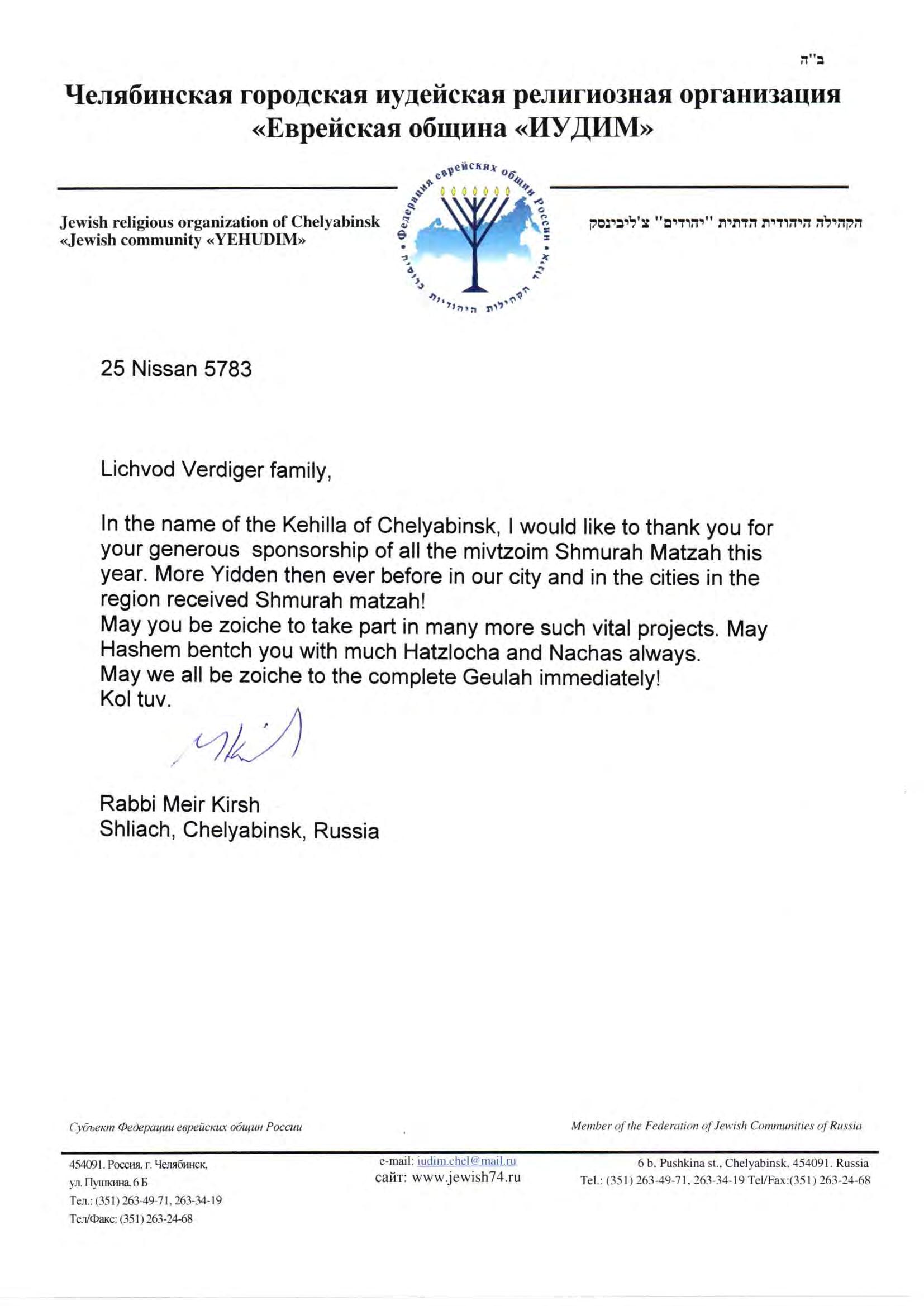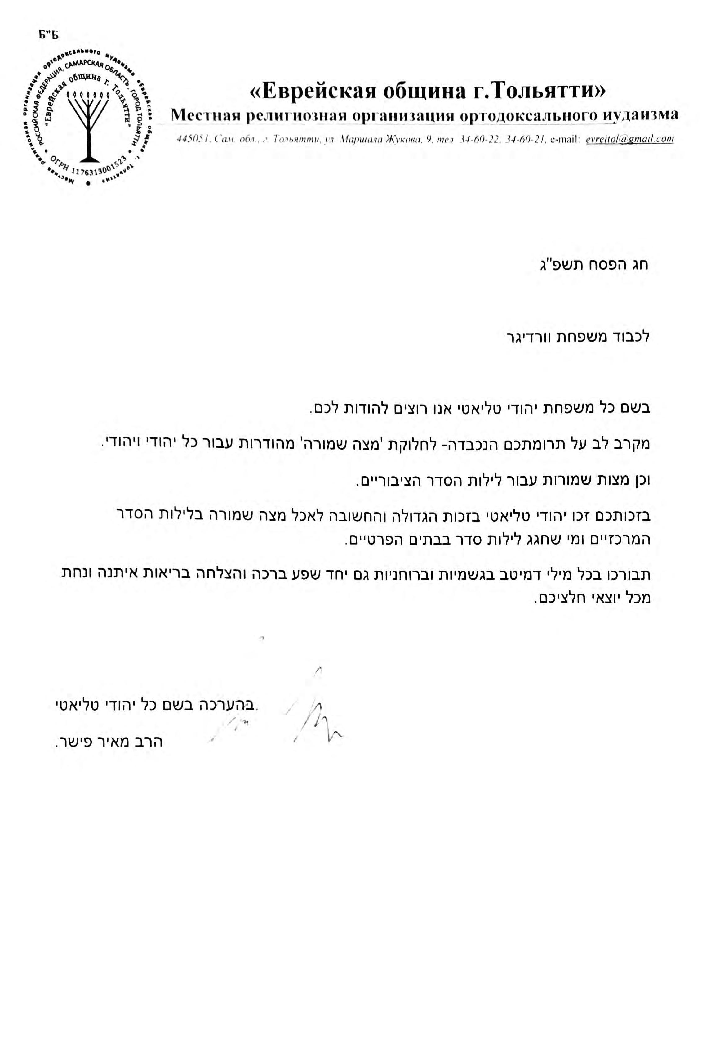 I would like to personally thank you for your care and concern over Pesach. With your assistance we were able to distribute Shmura Matza to close to 600 families in Istanbul, İzmir, Mersin, Erzurum and other locations in Turkiye.