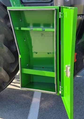Solid, romslig og praktisk verktøyskap til å erstatte stigtrinn på høyre side. Låsbart skap med hyller og opphengsmuligheter for verktøy. Luke for kontroll av batteri. 4 dreneringshull.