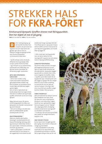 et er mating på gang, og det med fôr fra FKRA. Flere av dyrene ute på marka har registrert hva som skjer borte ved gjerdet, og er på vei mot oss. FKRA har mange forskjellige kunder, men få vet at Dyreparken i Kristiansand er blant dem. – Sjiraff, antilope, sebra, blissbukk, afrikansk struts og mange andre av dyra i parken får fôr fra FKRA – og vi forsyner oss av omtrent hele sortimentet som FKRA tilbyr, sier Michael Jansen, teamleder for Afrika/Asia jungel i dyreparken. Artig med dyreparken som kunde – Det er klart at det er artig å være leverandør til dyreparken, og kundeforholdet strekker seg flere år tilbake, sier kundekonsulent Harald Støyl ved FKRA Aust-Agder og Vest-Agder. Selv om han er spesialisert på landbruksdyr, klarer han også å bidra med råd om kraftfull næring til både sjiraffer, sebrahester så vel som til elg og hjort. Ifølge Michael Jansen får dyrene et lett fordøyelig fôr fra FKRA, som dyreparken selv blander med proteiner og annet tilskudd. – Det som er viktig, er at dette skal være et vedlikeholdsfôr og ikke produksjonsfôr, sier han. Kraftfôrblanding FKRA har cirka 85 ulike kraftfôrblandinger i produktspekteret sitt, tilpasset forskjellige dyreslag, alder og produksjon. Dette betyr at det er stor spennvidde i innhold av proteiner, mineraler og vitaminer. – Siden vi alltid prøver å utvikle det optimale fôret for hver dyreart, er det avgjørende å vite eksakt hva det