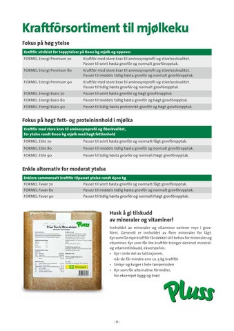 Husk å gi tilskudd av mineraler og vitaminer! Innholdet av mineraler og vitaminer varierer mye i grov fôret. Generelt er innholdet av flere mineraler for lågt. Kyr som får mye kraftfôr får dekket sitt behov for mineraler og vitaminer. Kyr som får lite kraftfôr trenger derimot mineral- og vitamintilskudd, eksempelvis: • Kyr i siste del av laktasjonen, når de får mindre enn ca. 5 kg kraftfôr • Sinkyr og kviger i hele tørrperioden • Kyr som får alternative fôrmidler, for eksempel bygg og brød