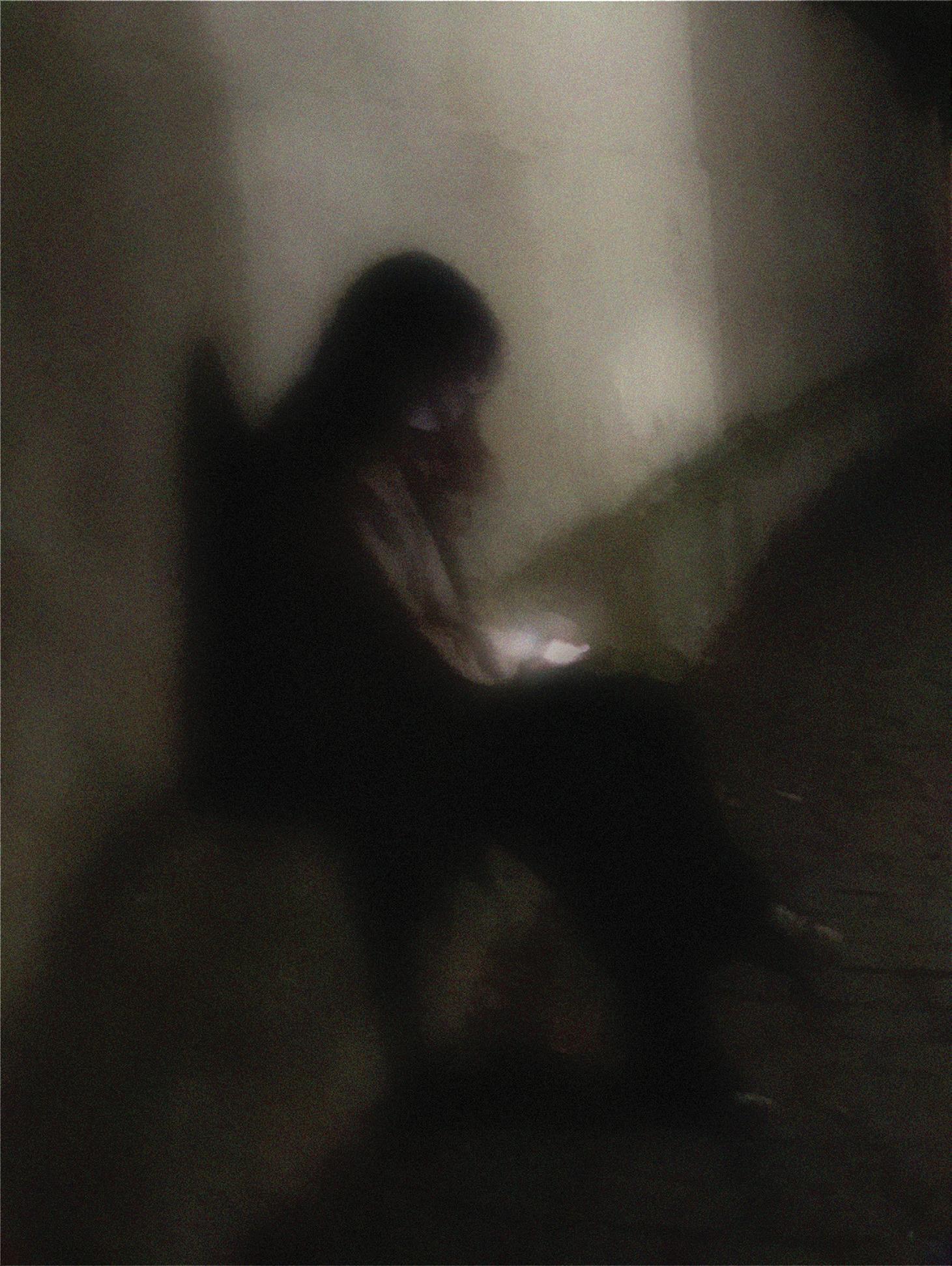 Sötétben, 34 x 25 cm, fotó, 2025. Lombhullás, 104 x 145 cm, vegyes technika, vászon, 1992.