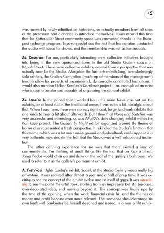 45 was curated by newly admitted art historians, so actually members from all sides of the profession had a chance to introduce themselves. It was around this time that the Rottenbiller Street community space was renovated, thanks to the Budapest exchange program. Less successful was the fact that few curators contacted the studio with ideas for shows, and the membership was not active enough. Zs. Keserue: For me, particularly interesting were collective initiatives brought into being in the new operational form in the old Studio Gallery space on Képíró Street. These were collective exhibits, created from a perspective that was actually new for the Studio. Alongside the formerly month-long, overwhelmingly solo exhibits, the Gallery Committee (made up of members of the management) tried to allow for projects of experimental, dynamically constituted formations. I would also mention Gábor Kerekes’s Kamikaze project -- an example of an artist who is also a curator and capable of organizing the annual exhibit. Zs. László: In the period that I worked here, the main focus was not on the exhibits, or at least not in the traditional sense. I was even a bit nostalgic about that. When I was there, there were no very significant, large landmark exhibits that one tends to hear a lot about afterwards. But I think that Notes and Sketches was very successful and interesting, as was AMBPA’s daily changing exhibit within the Kamikaze project. The Gallery by Night exhibit organized around the theme of horror also represented a fresh perspective. It rekindled the Studio’s function that this theme, which was a bit more underground and subcultural, could appear in a very authentic way, despite the fact that the Studio was a well-established institution. The other defining experience for me was that there existed a kind of community life. I’m thinking of small things like the fact that on Képíró Street, János Fodor would often go and draw on the wall of the gallery’s bathroom. We used to refer to it as the gallery’s permanent exhibit. Á. Fenyvesi: Uglár Csaba’s exhibit, Social, at the Studio Gallery was a really big adventure. It was realized after almost a year and a half of prep time. It was exciting to see the concept of the exhibit evolve and rid itself of gags. It was interesting to see the paths the artist took, starting from an impressive but still baroque, over-decorated idea, and moving beyond it. The concept was finally ripe by the time of the opening, when the world financial crisis hit, and the themes of money and credit became even more relevant. That someone should arrange his own bank with banknotes he himself designed and issued, in a non-profit exhibi-