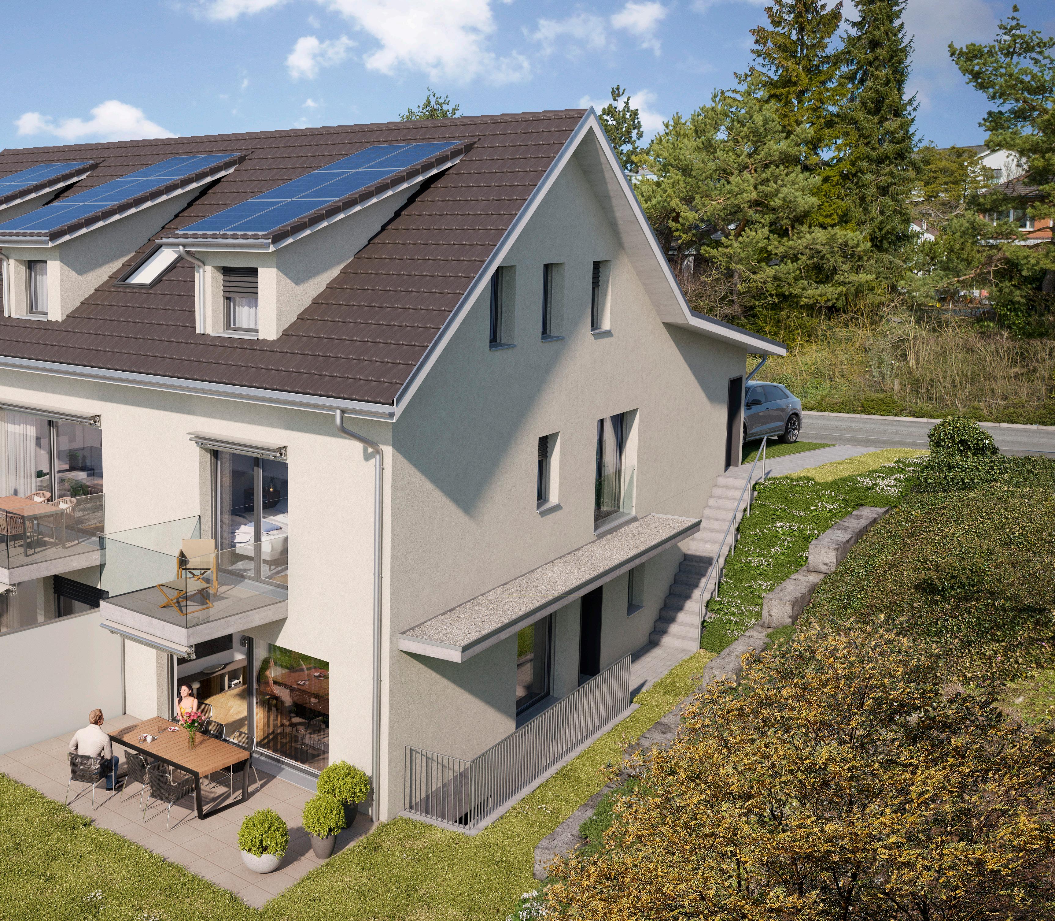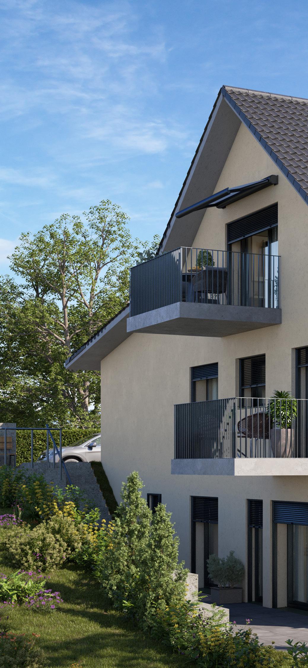 Die Wohnung im Dachgeschoss ist zusätzlich über eine Aussentreppe erschlossen. Bei den zwei Maisonettewohnungen befindet sich im Gartengeschoss mit Sitzplatz und eigenem Landanteil, das WohnenEssen und eine Nasszelle mit Dusche. Das Gartengeschoss erreichen Sie bequem über den Lift oder die Aussentreppe. Zusätzlich befinden sich in diesem Geschoss die Keller sowie der Technikraum. Sie haben die Möglichkeit im Gartengeschoss ein zusätzliches Zimmer zu realisieren.