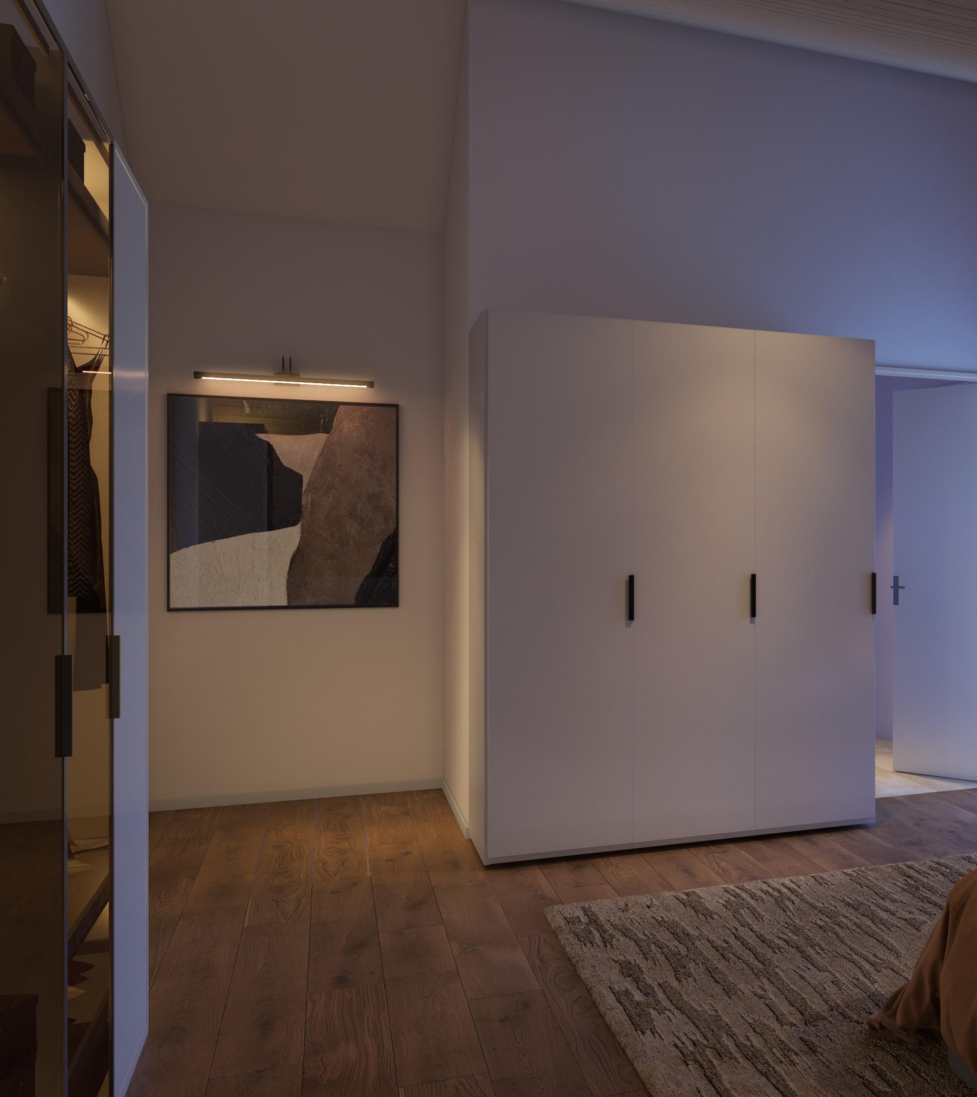 Das grosse Schlafzimmer mit Ankleide besitzt auch einen eigenen Balkon. Die grosszügige Nasszelle mit Dusche, Badewanne, WC und Waschmaschine/Tumbler ist dem Schlafzimmer direkt angegliedert.