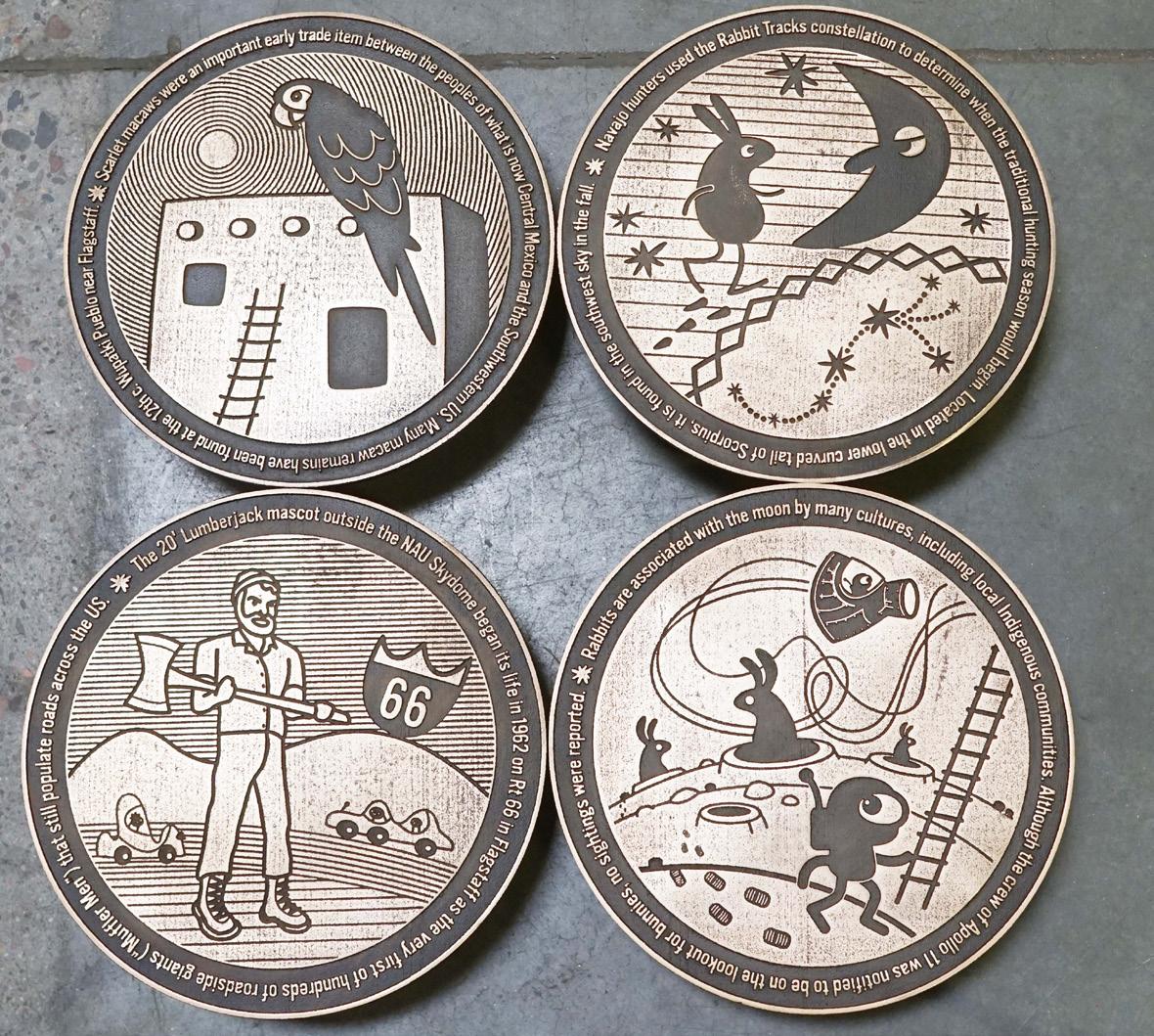 The accompanying 25 bronze medallion plaques, subtitled “Footnotes,” are embedded within the sidewalk adjacent to the fence and provide brief informational text about some of the fence section’s images and stories.