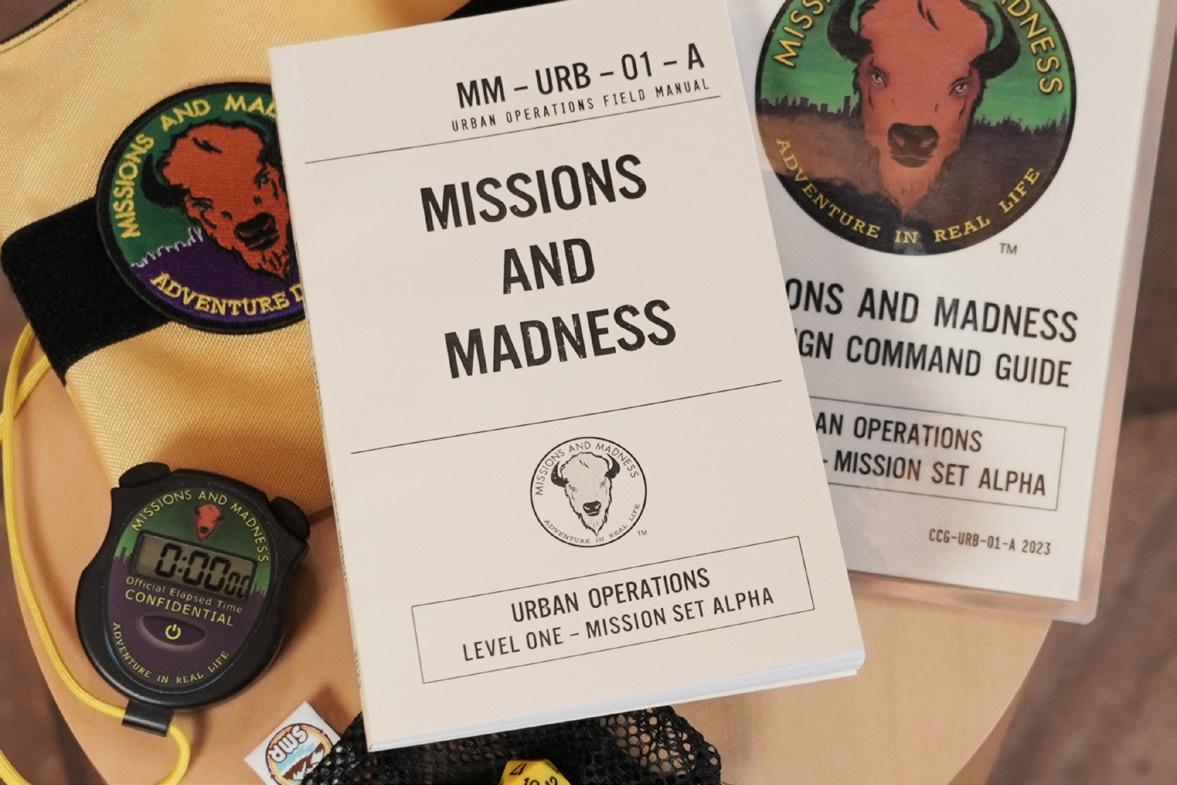 Missions and Madness can be played almost anywhere and is based on creative scenarios selected randomly with a roll of the dice. Participants may find themselves surrounded by zombies, stalked by dinosaurs, pestered by pirates, or any number of the 12 imaginary scenarios.