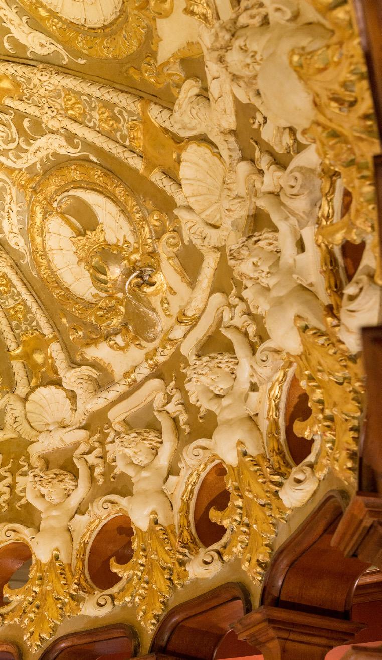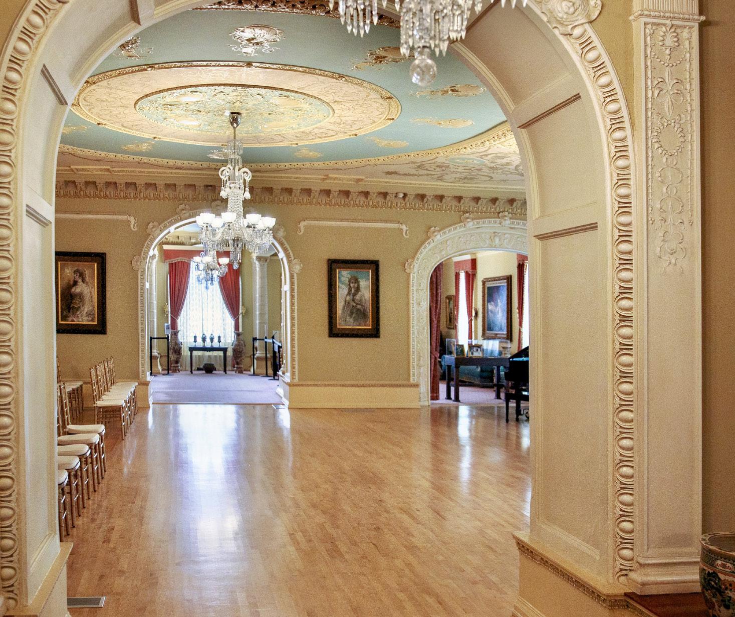 The New York painter Virgilio Tojetti painted the murals for the grand parlor on giant rolls of canvas that were then shipped to St. Augustine.