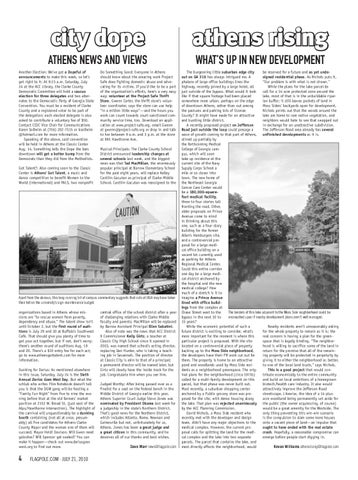 The burgeoning little suburban edge city be reserved for a future and as yet undeout on GA 316 has always intrigued me. A signed residential phase. As Nichols puts it, phalanx of large office buildings lines the “Our problem is with what is not shown.” highway, recently joined by a large hotel, all While the plans for the lake parcel do just outside of the bypass. What would it look call for a 14-acre protected zone around the like if that square footage had been placed lake, most of that is in the unbuildable riparsomewhere more urban, perhaps on the edge ian buffer; it still leaves pockets of land in of downtown Athens, rather than out among Moss Siders’ backyards open for development. the pastures and parking lots of Oconee Nichols points out that the woods around the County? It might have made for an attractive lake are home to rare native vegetation, and and bustling little district. neighbors would hate to see that swapped out A recently proposed project on Jefferson in exchange for an unattractive subdivision. Road just outside the loop could presage a The Jefferson Road area already has several wave of growth coming to that part of Athens, unfinished developments as it is. stirred up partially by the forthcoming Medical College of Georgia campus, which will soon take up residence at the current site of the Navy Supply Corps School a mile or so closer into town. The new home of the Northeast Georgia Cancer Care Center would be a 180,000-squarefoot medical facility, three to four stories tall fronting the road. Other, older proposals on Prince Avenue come to mind in thinking about this one, such as a four-story building for the former Allen’s Hamburgers site, and a controversial proposal for a large medical office building on a vacant lot currently used as parking for Athens Regional Medical Center. Could this entire corridor one day be a large medical district anchored by the hospital and the new medical college? How much of a stretch is it to imagine a Prince Avenue lined with office buildings from the complex at The borders of this lake adjacent to the Moss Side neighborhood could be Chase Street west to the encroached upon if nearby development plans aren’t well managed. bypass in the next 10 to 15 years? While the economic potential of such a Nearby residents aren’t unreasonably asking future district is exciting to consider, what’s for the whole property to remain as it is; the more important for the moment is where this real concern is having a plan for the greenparticular project is proposed. With the site space that is legally binding. “The neighborlocated on a controversial piece of property hood is willing to sacrifice some of the land in backing up to the Moss Side neighborhood, return for the promise that all of the remainthe developers have their PR work cut out for ing property will be protected in perpetuity by them. The property is home to an attractive giving it to either the neighborhood or, better, pond and woodlands used by Moss Side resito one of the local land trusts,” says Nichols. dents as a neighborhood greenspace. The origThis is a good project that would coninal plans for the neighborhood (circa 1970s) tribute economically to the entire community called for a multi-family development on this and build on local ambitions of a homegrown parcel, but that phase was never built out. biotech/health care industry. It also would Most recently, a suburban shopping center attractively improve the Jefferson Road anchored by a Publix grocery store was prostreetscape. Likewise, the idea of a 14-plusposed for the site, with dense housing along acre woodland being permanently set aside for the lake. That plan was rejected unanimously the public (the owner acquiescing, of course) by the ACC Planning Commission. would be a great amenity for the Westside. The David Nichols, a Moss Side resident who only thing preventing this win-win scenario recently met with the developer and design is the compulsion to slam some more houses team, didn’t have any major objections to the onto a vacant piece of land—an impulse that medical complex. However, the current proought to have ended with the real estate posal calls for splitting the land for the medicrash. Hopefully, a reasonable compromise can cal complex and the lake into two separate emerge before people start digging in. parcels. The parcel that contains the lake, and most directly affects the neighborhood, would Kevan Williams athensrising@flagpole.com