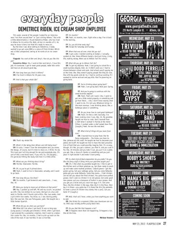 everyday people Demetrice Riden, Ice Cream Shop Employee This week, several of the people I asked for an interview were “not from around here” or “just visiting Athens.” But with a little determination, I found Demetrice Riden, who has lived in Athens for his entire life. Well, all but six months of it. He says he loves it here, but that he’s ready to move on. By the time I was done talking to Demetrice, I really wanted to go get some BBQ or a piece of fried chicken. Which was a little unexpected, seeing as he works at an ice cream shop. Flagpole: You work at Ben and Jerry’s. How do you like this job? Demetrice Riden: Yes, I work at Ben and Jerry’s. I love this job; it’s awesome. I get to meet great people, make kids smile and have an all-around good day. FP: How long have you lived in Athens? DR: I’ve lived in Athens for 29 years now. FP: And is that your whole life?