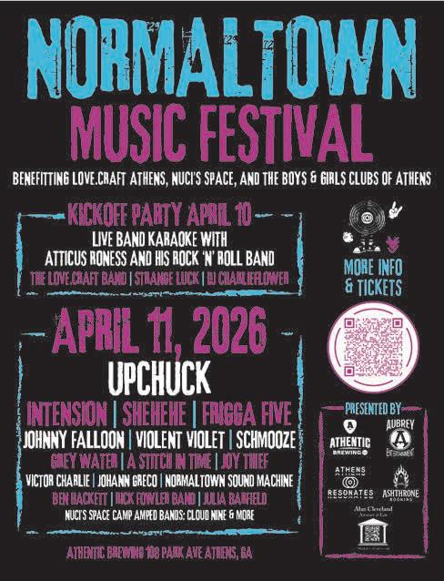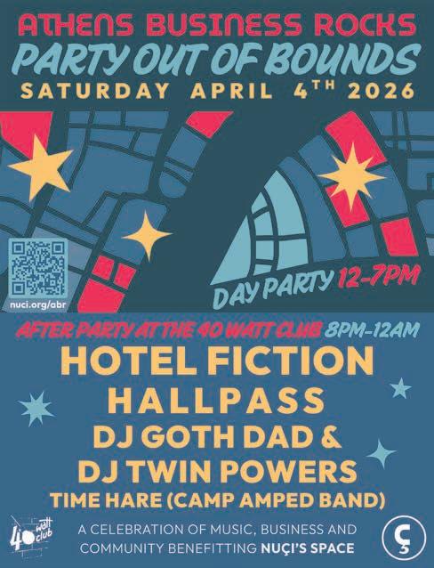 organization’s founder. A day party will be held from 12–7 p.m. featuring bands and musicians performing at various businesses and venues, generally centralized around downtown. Performances will be staggered so that attendees can catch multiple acts throughout the day. Then the celebration will continue with an official afterparty at the 40 Watt Club, with doors opening at 7 p.m. and the show starting at 8 p.m. Hotel Fiction will headline with support from Hallpass, DJ Goth Dad and DJ Twin Powers. Tickets are $25, available at givebutter.com/ABR2026, where larger donations can be given.