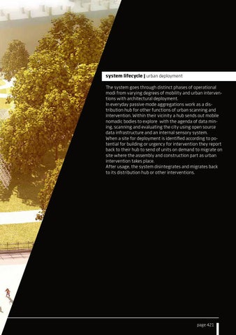 system lifecycle | urban deployment The system goes through distinct phases of operational modi from varying degrees of mobility and urban interventions with architectural deployment. In everyday passive mode aggregations work as a distribution hub for other functions of urban scanning and intervention. Within their vicinity a hub sends out mobile nomadic bodies to explore with the agenda of data mining, scanning and evaluating the city using open source data infrastructure and an internal sensory system. When a site for deployment is identified according to potential for building or urgency for intervention they report back to their hub to send of units on demand to migrate on site where the assembly and construction part as urban intervention takes place. After usage, the system disintegrates and migrates back to its distribution hub or other interventions.