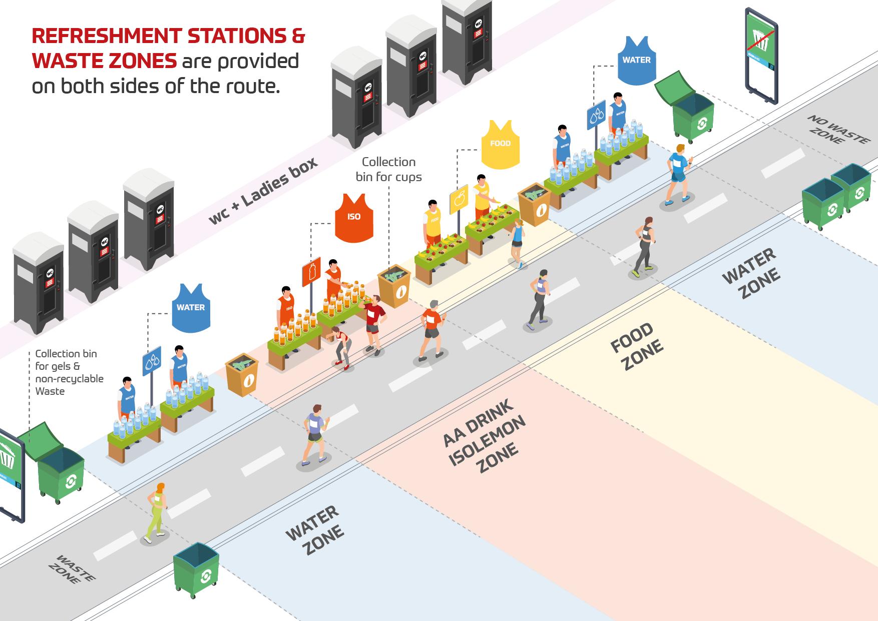 Alle bevoorradingszones zijn ingericht voor uw comfort. Aan het begin en het einde van elke post voorzien wij twee waterzones, met daartussen Powerade en snacks. Aan elke bevoorradingspost vindt u ook toiletten en vuilnisbakken, zodat u uw lege gels en ander afval daar kunt weggooien.