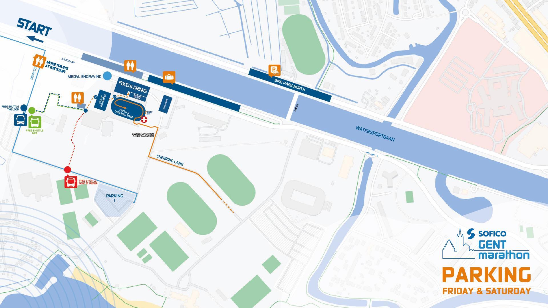 Lopers en supporters van de Sofico Gent Marathon kunnen parkeren in de Parking The Loop (halve marathon), Ikea (marathon) of Gent-SintPieters. Alle parkings zijn bereikbaar vanaf de R4 en kosten vanwege de marathon slechts 17 EUR waarbij u 8 uur kunt parkeren.